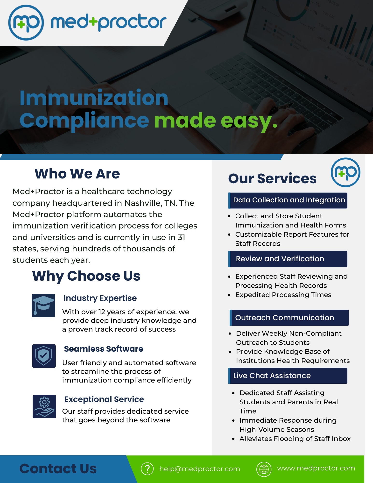 MedProctor provides a comprehensive solution that prioritizes compliance and security, helping colleges and universities meet regulatory requirements with confidence. By focusing on student experience and accessibility, we ensure that submitting and accessing health documentation is simple and user-friendly. Institutions also benefit from significant cost and time savings, by minimizing administrative workload. Additionally, MedProctor offers customization and integration options, allowing our services to align seamlessly with each institution’s unique systems and needs.